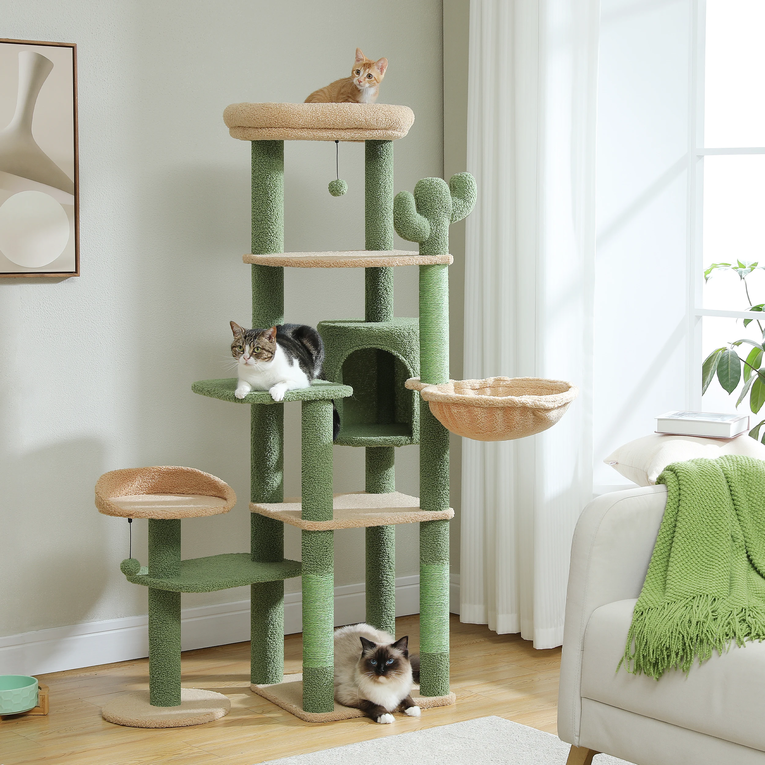 Das einzigartige Design in Kaktusform bringt eine spielerische und natürliche Note in Ihr Zuhause. Der grüne Sisal und die beigen Liegeflächen verleihen dem Kratzbaum einen frischen Look, der jeden Raum aufhellt. Neben seiner optischen Attraktivität ist der Kratzbaum auch äußerst funktional und robust.