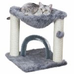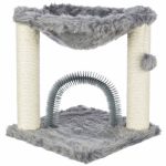 Unser Kratzbaum Baza mit integriertem Fellpflegebogen bietet deiner Samtpfote alles, was sie braucht – Sisalstämme zum Kratzen und Klettern sowie eine gemütliche Liegemulde zum Ausruhen.